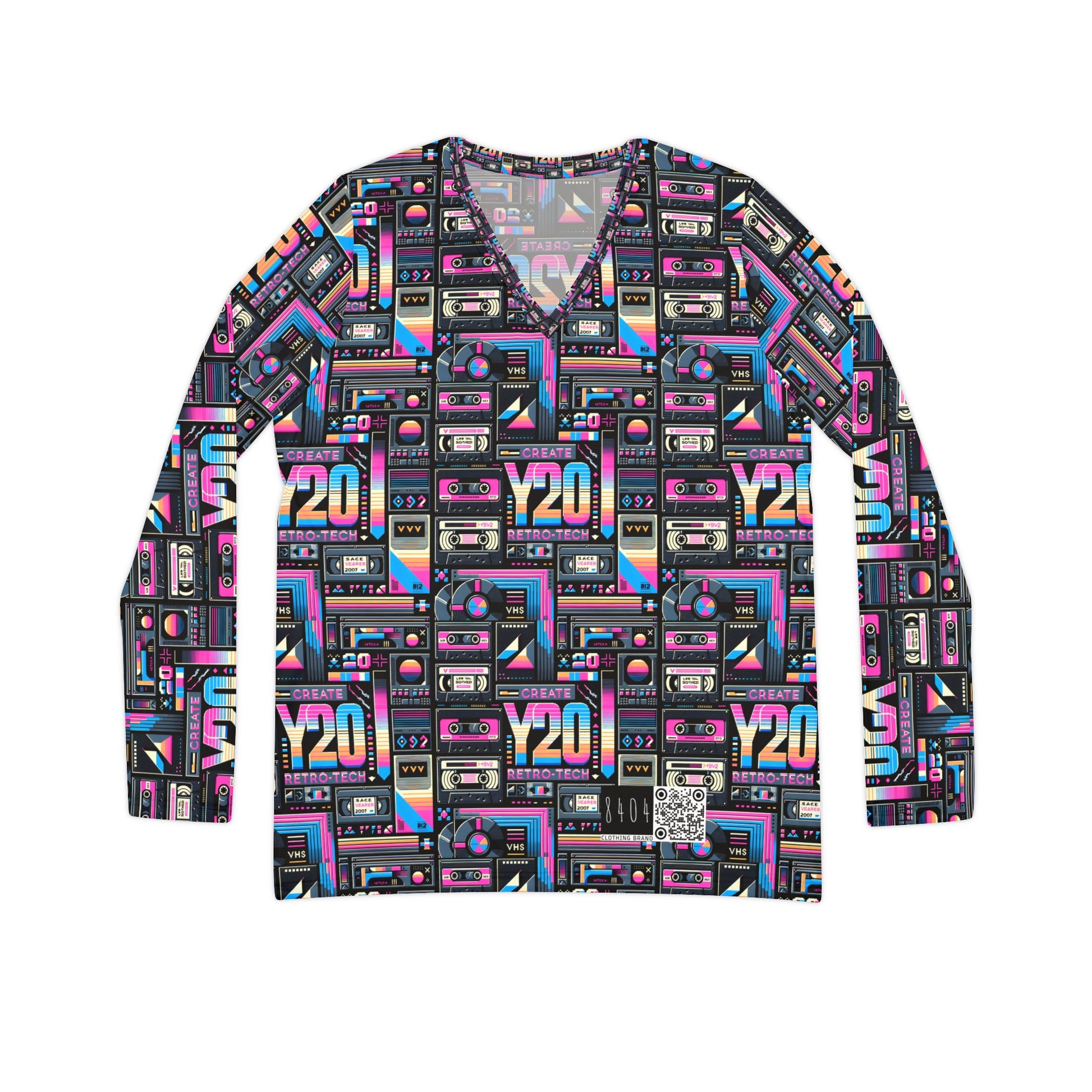 Digital Nostalgia Tech-Inspired Retro Fusion Women's Long Sleeve V-Neck Shirt - 8404 Design-65