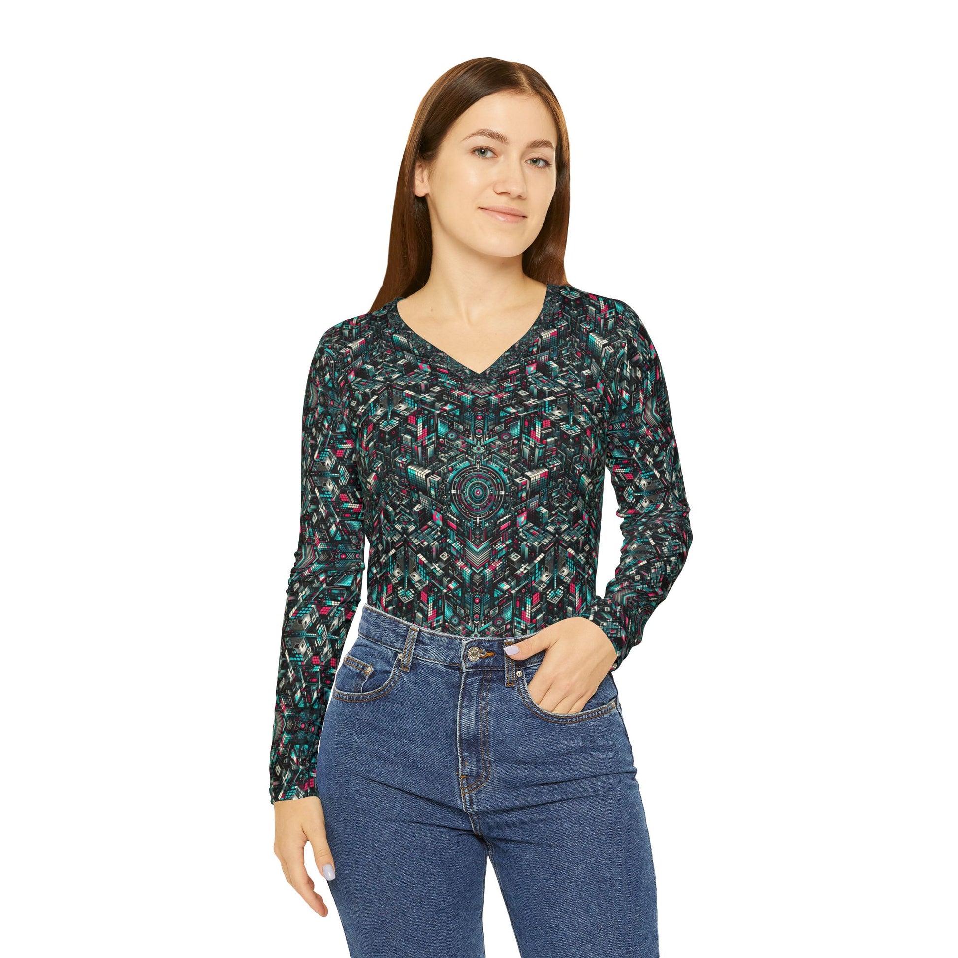 Digital Rebellion Tech-Inspired Streetwear Women's Long Sleeve V-Neck Shirt - 8404 Design-54